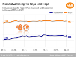 26.11.2025 (AMI) – Die Zweifel über das Tempo Chinas beim Kauf von US-Sojabohnen drücken auf die Kurse in Chicago. Zudem bleibt der Wettbewerb mit den südamerikanischen Lieferanten hart.   Mehr