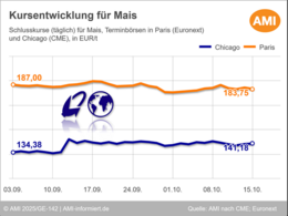 16.10.2025 (AMI) – Größere Ausschläge bleiben aber aus, da wichtige Kennzahlen angesichts des Shutdowns in den USA fehlen. In Paris tendiert Mais schwächer, wobei trübe EU-Ernteaussichten die Verluste begrenzen.   Mehr