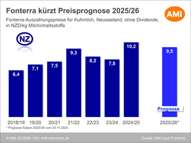 05.12.2025 (AMI) – Die neuseeländische Molkerei Fonterra hat ihre Milchpreisprognose für die Saison 2025/26 reduziert.   Mehr