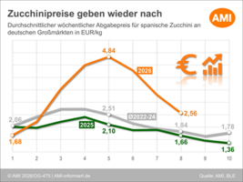 19.02.2026 (AMI) – Die Trendwende bei Zucchini ist eingeleitet. An den spanischen Vermarktungseinrichtungen stehen im Vergleich zu den Vorwochen höhere Mengen zum Verkauf. Die hohen Preise der zurückliegenden Wochen haben den Absatz inzwischen so deutlich gebremst, dass die verfügbaren Mengen nun ausreichen.   Mehr