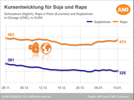 14.01.2026 (AMI) – Sojabohnen gerieten in Chicago angesichts einer erwarteten Rekordernte in Brasilien und schwächerer US-Exportperspektiven unter Druck. Dagegen legte Raps in Paris zu, gestützt durch deutlich festere Canolanotierungen in Kanada und Spekulationen über eine mögliche Entspannung im Zollkonflikt mit China.   Mehr