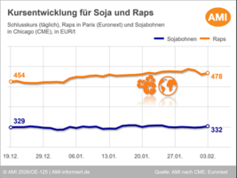 04.02.2026 (AMI) – Soja pendelt weiter zwischen festen Impulsen aus dem Ölkomplex und Angebotsdruck aus Südamerika. Raps legt trotz komfortabler EU-Versorgung weiter zu.   Mehr