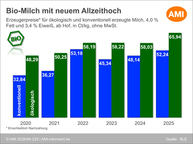01.04.2026 (AMI) – Die Erzeugerpreise für konventionelle Kuhmilch lagen im Jahr 2025 über weite Strecken auf Rekordkurs. Ab Spätsommer führten expansive Milchmengen zu Preisdruck und zunehmenden Abschlägen. Dennoch wurde das zweithöchste Jahresergebnis erzielt. Die Preise für Bio-Milch zeigten sich dagegen weitgehend stabil und erreichten einen neuen historischen Höchstwert.   Mehr