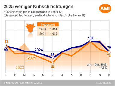 26.02.2026 (AMI) – Im Jahr 2025 nahmen die bundesweiten Kuhschlachtungen im Vergleich zum Vorjahr ab. Mit Ausnahme des Januars bewegten sich die Stückzahlen im Jahresverlauf durchgehend unter dem Vorjahresniveau.   Mehr