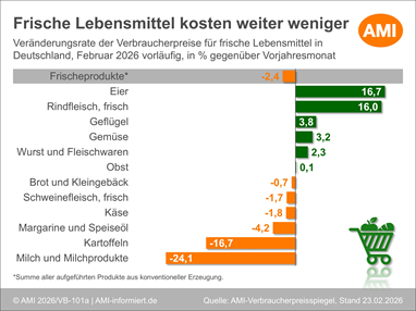 26.02.2026 (AMI) – Im Frische-Bereich schwächt sich die Teuerungsrate weiter ab. Mehrere Warengruppen wirken mit ihrem niedrigeren Preisniveau deutlich stärker als die Warengruppen mit höheren Preisen. Seit März 2024 liegt nun die niedrigste Teuerungsrate vor.   Mehr
