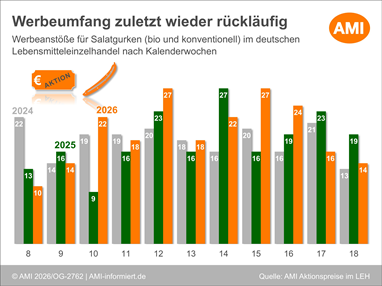 29.04.2026 (AMI) – Ende April bleibt die Angebotssituation auf dem Markt für Salatgurken angespannt. Nach wie vor steht sowohl im Inland als auch im Ausland ein großes Angebot zur Verfügung. Aktuell drängt die Ware über den Preis – auch über Werbeaktionen im LEH – zum Verkauf.