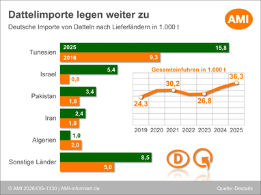 20.03.2026 (AMI) – Datteln liegen im Trend, die Einfuhren nach Deutschland sind in den vergangenen Jahren kontinuierlich gestiegen. Droht nun eine Trendumkehr oder gar eine Knappheit? Immerhin hat der Iran ein Exportverbot für Agrarprodukte, darunter auch Datteln, verhängt. Doch welche Rolle spielen Datteln aus dem Iran überhaupt für den deutschen Markt?