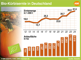 03.11.2025 (AMI) – Im Jahr 2024 wurden nach der Gemüseerhebung des Statistischen Bundesamts (Destatis) auf insgesamt 2.018 ha Bio-Kürbisse angebaut. Im Vergleich zum Vorjahr waren dies 4 % weniger.   Mehr