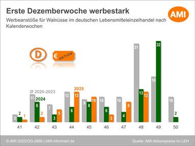 27.11.2025 (AMI) – Angebote mit Walnüssen sind in diesem Jahr rar. Das liegt unter anderem an geringen Mengen aus der Vorsaison und an der US-amerikanischen Zollpolitik. Auch wenn in den Werbeaktionen eher französische Walnüsse beworben werden, wirkt sich die Angebots- und Preissituation bei Walnüssen aus den USA auf den Angebotsumfang aus.