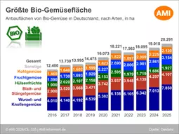 (AMI) – Deutschland ist ein Wurzel- und Knollengemüseland, insbesondere im ökologischen Gemüsebau. Mit 7.850 ha stellte diese Obergruppe 2025 mehr als ein Drittel der gesamten Bio-Gemüsefläche. Gegenüber 2024 kam knapp 12 % Fläche dazu.