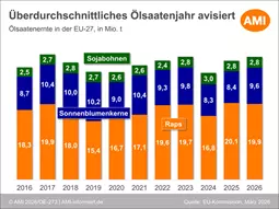 (AMI) – Die EU-Kommission veröffentlichte Ende März ihre erste Schätzung zur Ölsaatenernte 2026. Insgesamt dürfte die EU rund 32,3 Mio. t Ölsaaten ernten und damit die größte Menge seit drei Jahren erzielen.