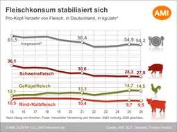 (AMI) – Nachdem der Konsum von Fleisch im Jahr 2022 seinen niedrigsten Wert mit 52,8 kg pro Kopf und Jahr erreicht hatte, stieg der Verzehr bis 2025 nun drei Jahre in Folge moderat an.