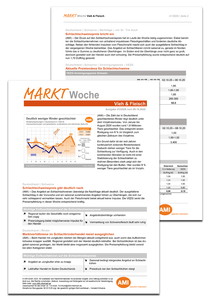 Profitieren Sie vom kompakten Marktüberblick: Nationale und internationale Marktlage sowie die wichtigsten Preise und Schlachtmengen. Erfahren Sie mehr zu den Hintergründen und Fakten mit den Kommentaren und Analysen der Marktexperten. Mehr